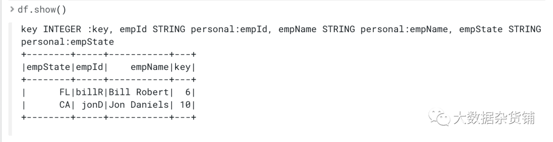 下面是一个演示此示例。首先,将2行添加到 HBase 表中,并将该表加载到 PySpark DataFrame 中并显示在工作台中。然后,我们再写2行并再次运行查询,工作台将显示所有4行。