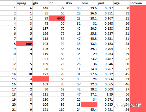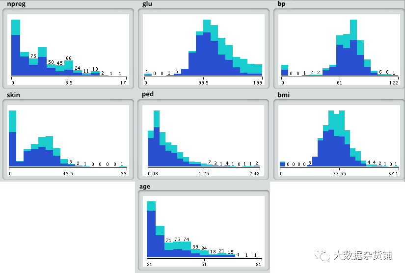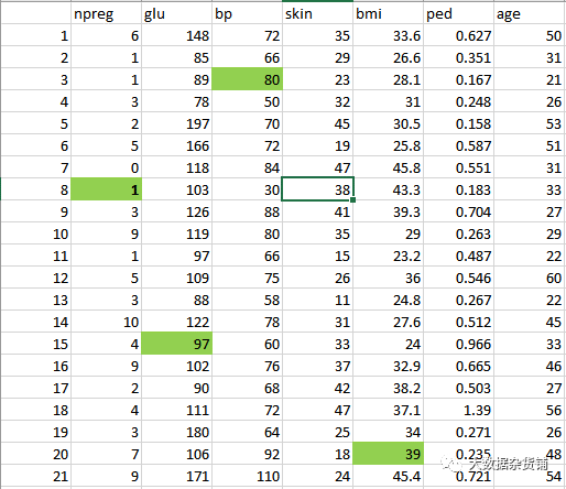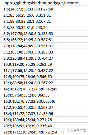 1. npreg –怀孕次数2. glucose–血浆葡萄糖浓度3. bp –血压4. skin–三头肌皮褶厚度5. bmi –体重指数6. ped –糖尿病谱系功能7. age–年龄8. income–收入