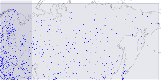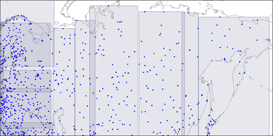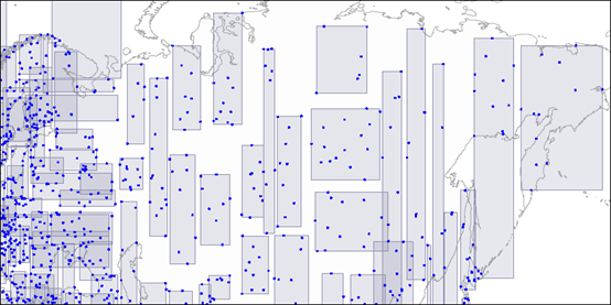 为了可视化这种结构,我们提供了R-tree的三个层次的图像。点是机场的坐标(类似于演示数据库的“ airports”表中的坐标,但提供了来自openflights.org的更多数据)。