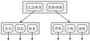 搜索从根节点开始。矩形(2,1)-(7,4)与(1,1)-(6,3)相交,但不与(5,5)-(8,8)相交,因此不需要下降到第二个子树。
