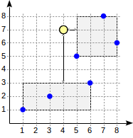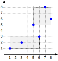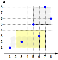 该信息足以返回前两个点(5,5)和(7,8)。由于我们知道到矩形(1,1)-(6,3)内的点的距离为4.0或更大,因此我们不必下降到第一个子节点。