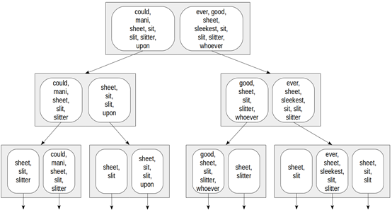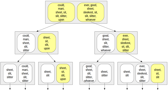 索引应如何组织?不能直接使用R树,因为尚不清楚如何为文档定义“边界矩形”。但是我们可以对这种方法进行一些修改,即所谓的RD树(RD代表“Russian Doll”)。在这种情况下,集合被理解为词素集合,但是通常,集合可以是任何集合。