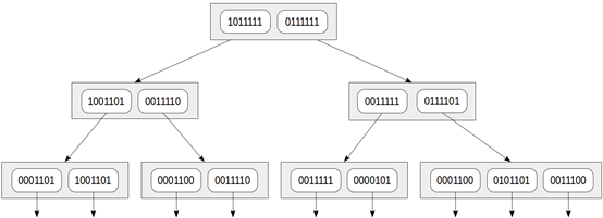 显然,在根节点中,签名退化为“all ones”,即一个索引级别变得绝对无用(另外一个索引级别变得几乎无用,只有四个假位)。
