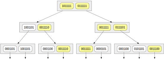 与上图比较:我们可以看到树变成了黄色,这意味着出现误报,并且在搜索过程中经过了过多的节点。在这里,我们选择了“ whoever”语素,但不幸的是,其签名与“sit”语素的签名相同。重要的是,模式中不会出现误报,也就是说,我们确保不要错过所需的值。