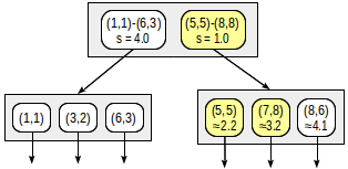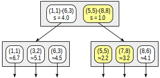 搜索从根节点开始。该节点包含两个边界矩形。到(1,1)-(6,3)的距离是4.0,到(5,5)-(8,8)的距离是1.0。