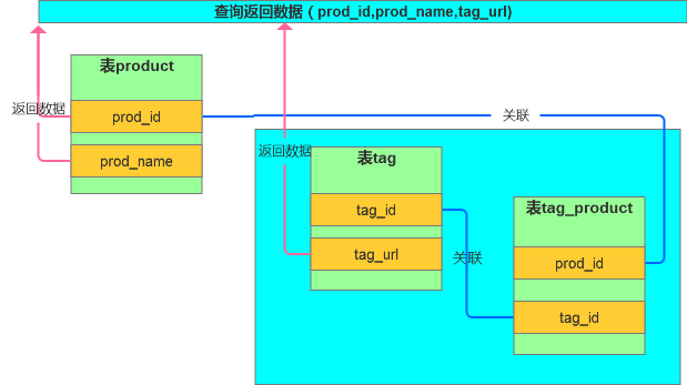 整个SQL的逻辑是输出其中product表的数据(字段prod_id,prod_name)和tag表的数据(tag_url),其中表tag和表tag_product)他们通过字段(tag_id)进行关联,然后和外部的表使用prod_id进行关联,为了体现出是left join(左连接),我把表product的位置及往上放了放。