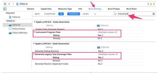 在BuildSettings分别设置Instrument Program Flow、Generate Legacy Test Coverage File为True,即可打开插桩。