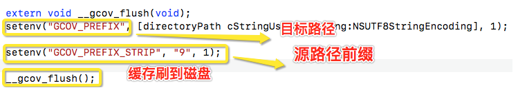 通过Pod的插件方式,我们使用C++混编,调用外部的__gcov_flush方法把覆盖率gcda从内存刷到硬盘。为了方便交叉编译,GCC设计了两个与生成路径相关的变量GCOV_PREFIX,GCOV_PREFIX_STRIP,如下图。