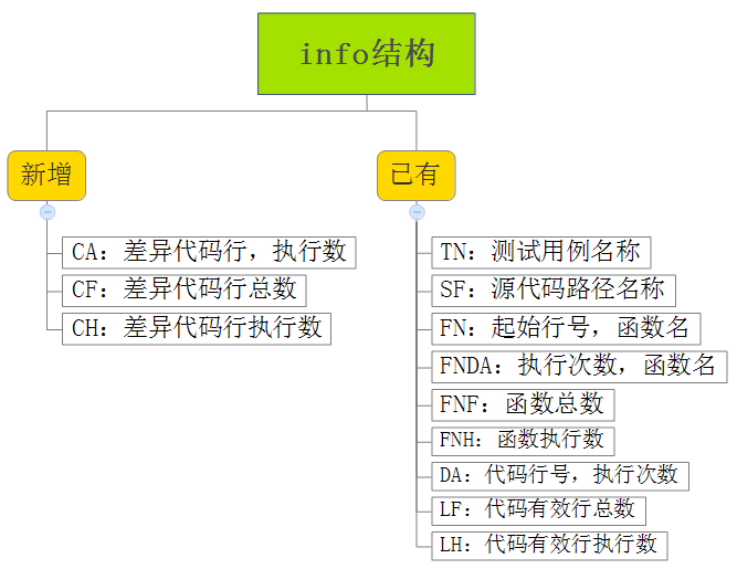 我们使用开源LCOV来处理文件,gcda+gcno+源码可生成中间文件info,info文件包含了最终呈现报告的所有信息,包括源码路径、函数名、函数执行次数、函数总数、函数在源文件的位置、行号、行执行次数、行总数。为支持行差异覆盖率,我们自定义了新字段CA/CF/CH,请见图6。