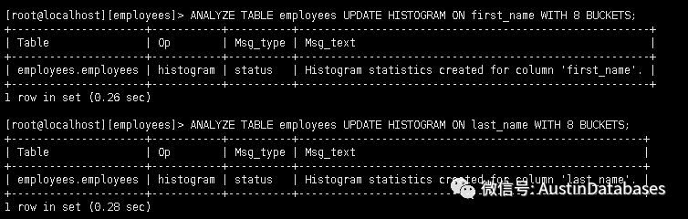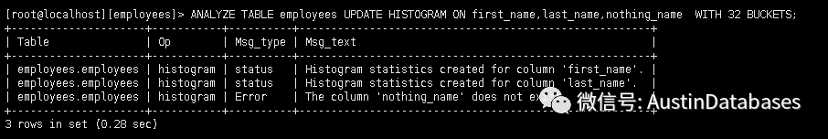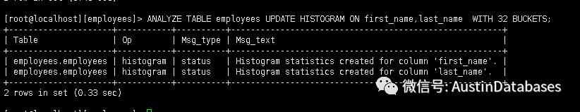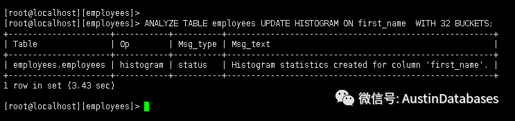 ANALYZE TABLE employees UPDATE HISTOGRAM ON first_name WITH 32 BUCKETS;