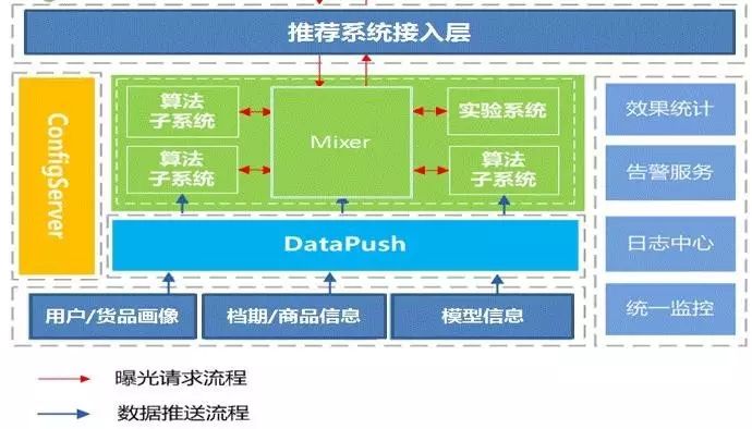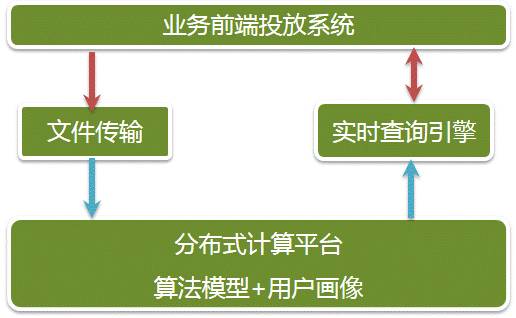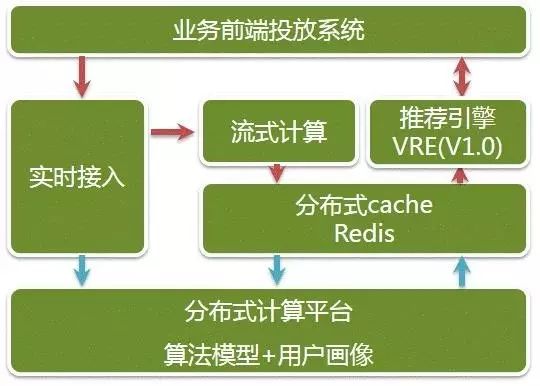 上图所示,通过业务系统把所有的用户信息和商品信息通过接口的方式同步到离线平台,进行离线暴力式地批量计算,把结果推荐到实时查询引擎上去提供对外服务。