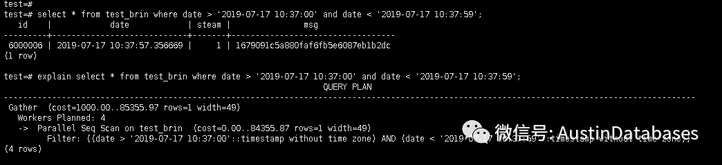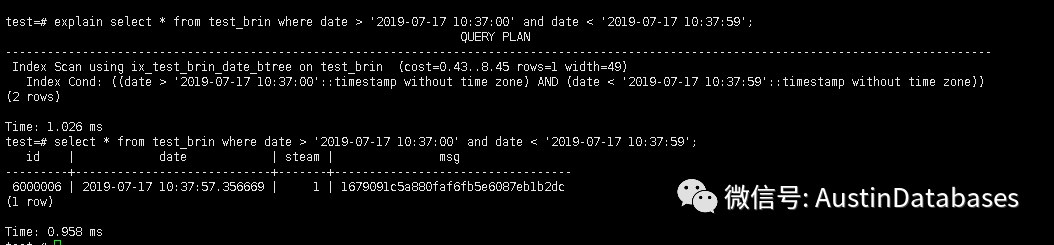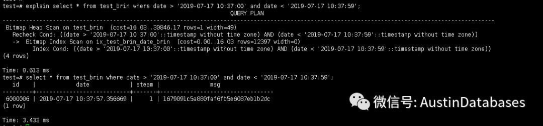 从上图可以看出,添加索引后,查询的速度提高了,但我们的关键点不在这里,我们是要比较,BTREE 索引 和 BRIN 索引之间的不同点。