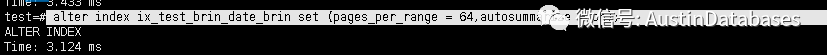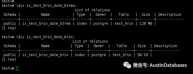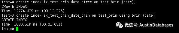 我们在同样的表的同样的字段创建,不一样类型的索引。通过图形中我们可以看出创建两种索引的时间是不一样的,brin 索引的速度比 BTREE 索引要快大约不到 12倍。