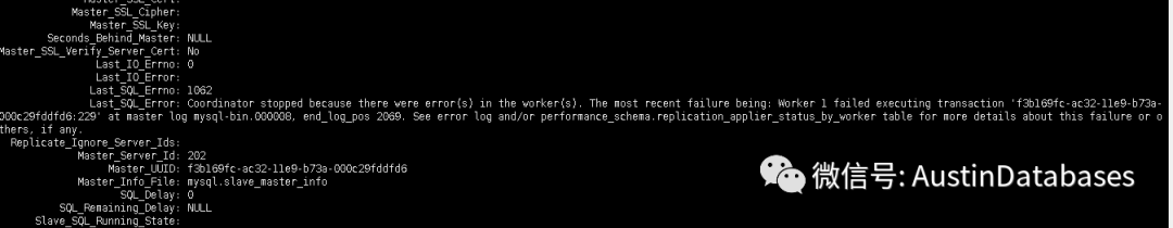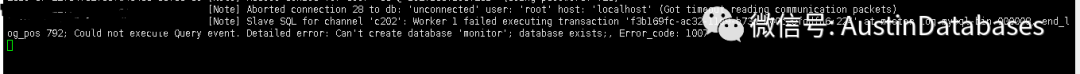 那么马上问题就在数据汇聚库 201 上出现问题,我先后在 200 ,和 202 两台机器上建立monitor 数据库,按照逻辑来说,201 的复制 关于202 的复制应该会停,但由于特殊的设置,并未停止复制。但201 的错误日志,会毫不留情的记录这个错误。