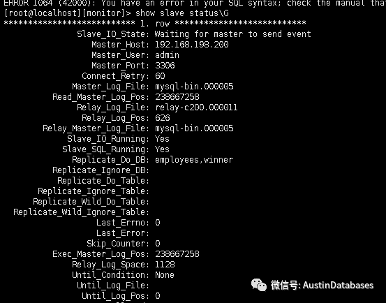 我们先停止201 上的复制,stop slave; 然后将201 上的monitor 数据库删除