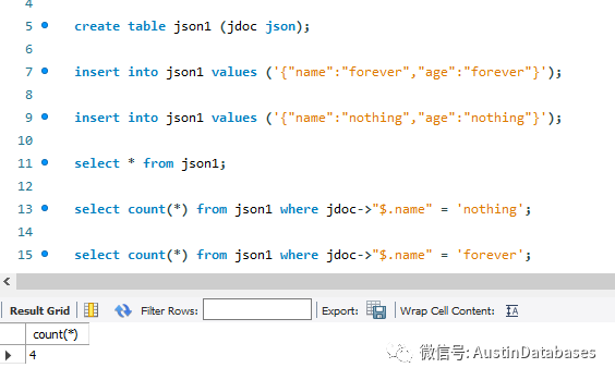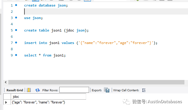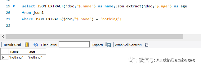 而如果将JSON 的数据以 MYSQL 的方式进显示,则需要借助于MYSQL 为JSON 开发的一些函数,例如 JSON_EXTRACT 下图是 json1 中的数据