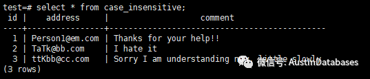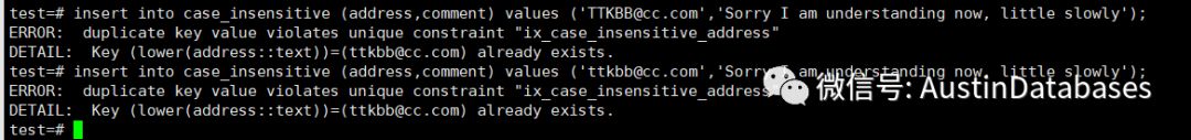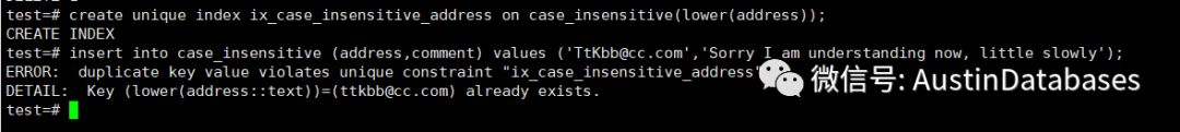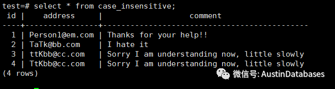 insert into case_insensitive (address,comment) values ('ttKbb@cc.com','Sorry I am understanding now, little slowly');