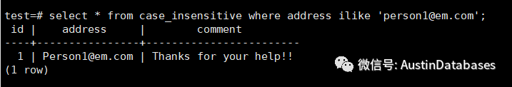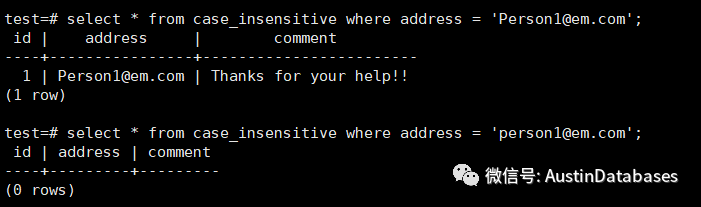 insert into case_insensitive (address,comment) values ('Person1@em.com','Thanks for your help!!');