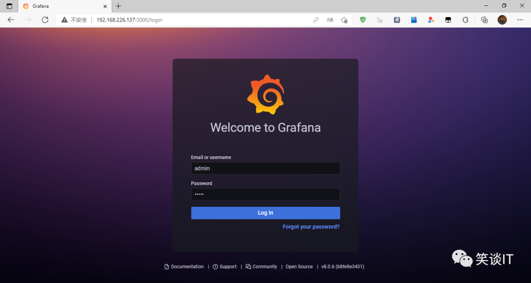 至此,我们确认服务和端口都没有问题后,就可以通过http://ip:3000来访问我们刚部署好的Grafana了。