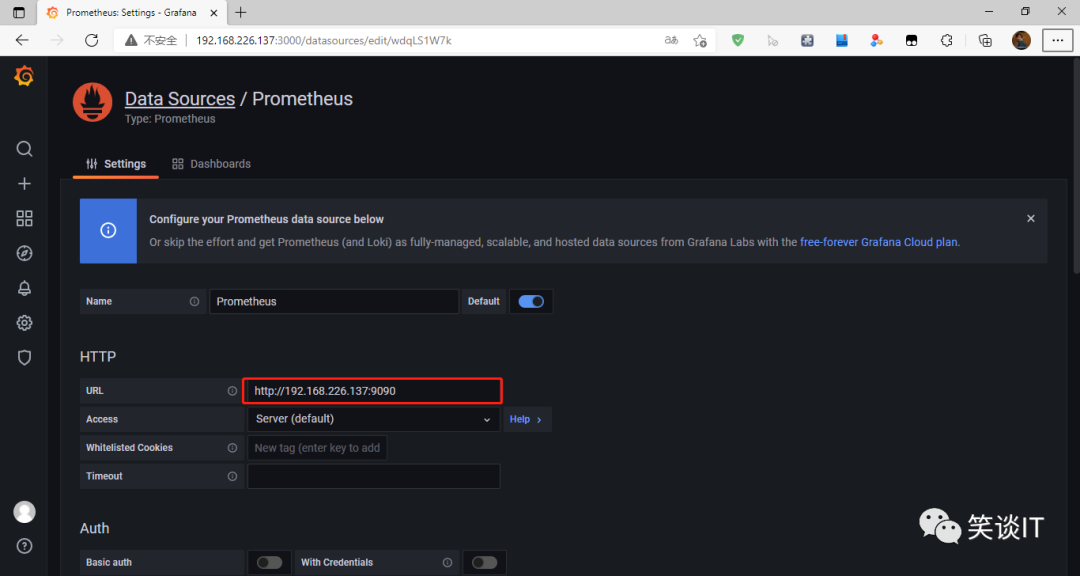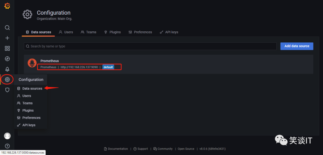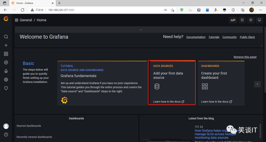 登录进来后,我们第一要配置数据源,将我们Prometheus数据源加入到Grafana中来。