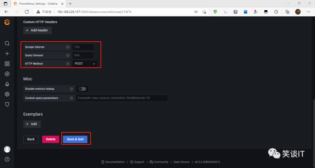输入Prometheus的URL地址后,在最下方选择“Save&test”,即完成了Prometheus数据源的添加。我们也可以在这里面去调整Grafana从Prometheus里面去获取数据的时间设定以及抓取方式。