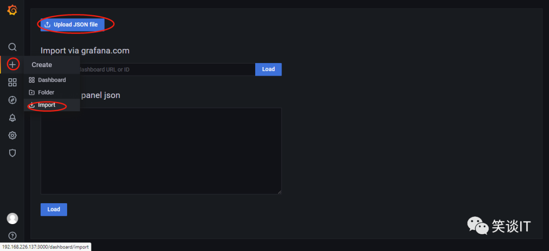 然后在Greate中选择import,再选择"Upload JSON file",将我们下载好的json文件上传至Grafana
