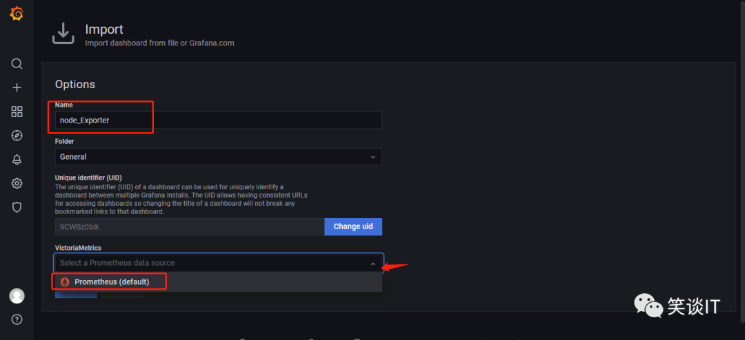 这个看板的默认名称是"1 Node Exporter for Prometheus Dashboard CN v20201010"我们也可修改看板的名称,比如我们修改成“node_Exporter”,然后选择我们刚刚添加的Prometheus数据源,点击最后的import。
