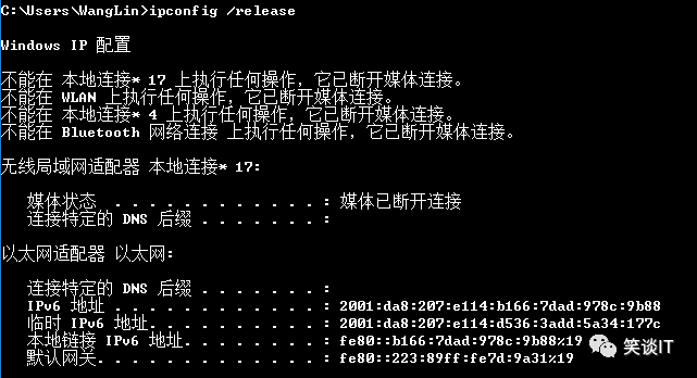(2)在cmd中输入ipconfig release 断开网络连接。