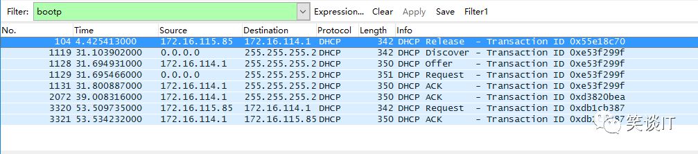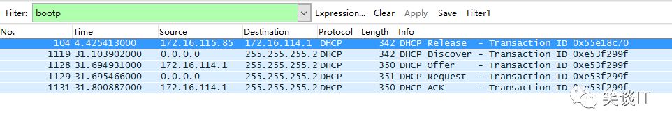 此时,可以看到在Wireshark中新增了4个DHCP数据包: