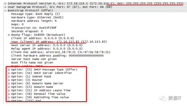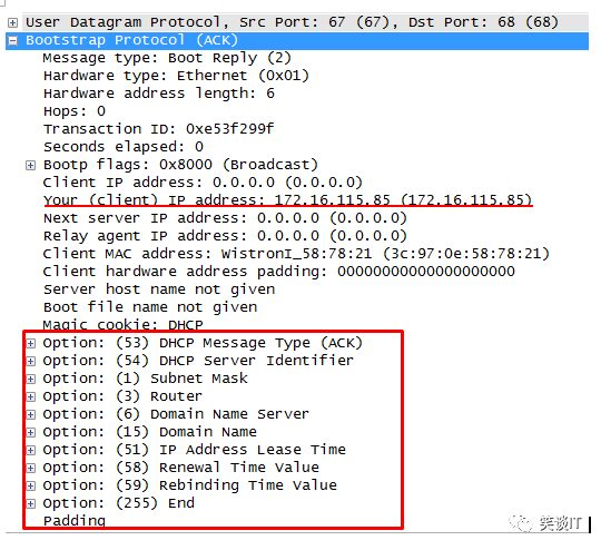 后面有许多项option信息,前两项是DHCP服务器发送的消息类型(ACK)和服务器的身份标识,后面几项是: