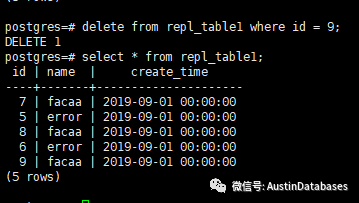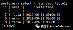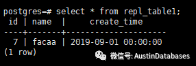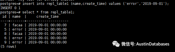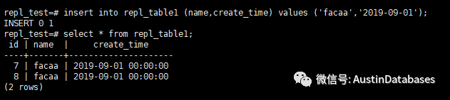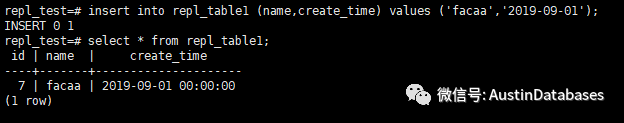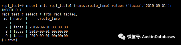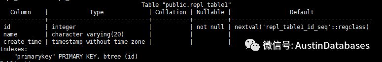 create table repl_table1 (id serial constraint primarykey primary key,name varchar(20),create_time timestamp);