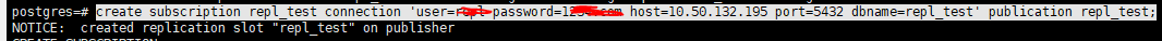 create subscription repl_test connection 'user=repl password=password host=10.50.132.195 port=5432 dbname=repl_test' publication repl_test;