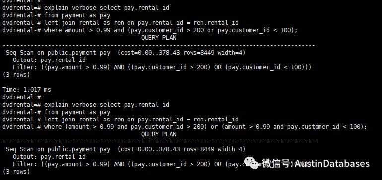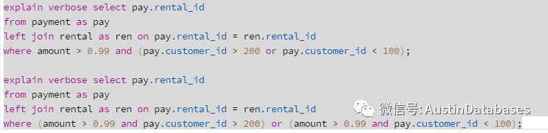 最后类似条件中,意义一样写法不一样的情况下,POSTGRESQL 也会根据集合的概念,将其写法统一化
