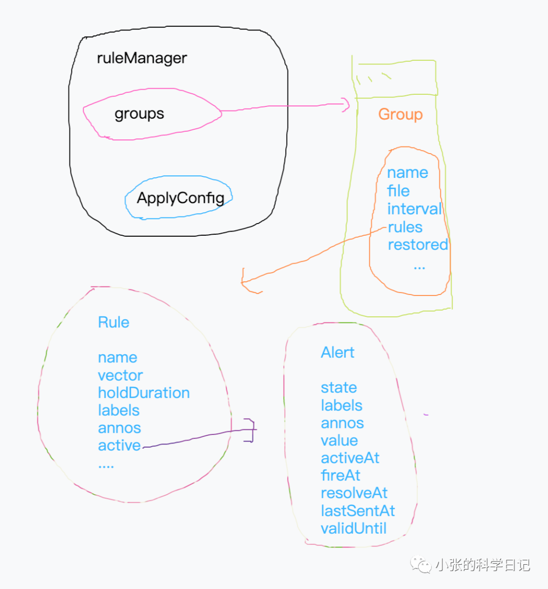 规则部分核心实体就这几个,其流程一目了然,在Prometheus启动后创建ruleManager,之后通过ApplyConfig方法,将我们配置文件中的规则组定义变成如上图所示的具体对象。