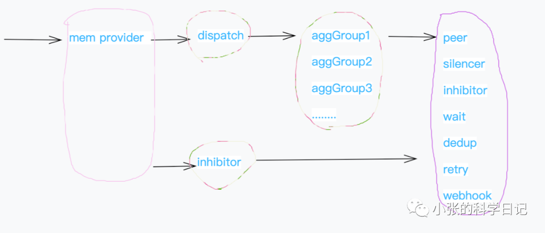 dispatch就是其中一个listener,也是最重要的一个,它根据我们定义的route,将alert分配给对应的aggGroup,由aggGroup对alert进行集群、沉默、抑制、发送等操作。