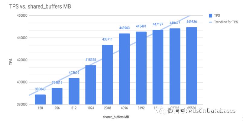 与其他的数据库不同,postgresql 使用了 double 缓冲技术,postgresql本身是不对接I/O的 postgresql的缓冲是对接LINUX的缓冲区,这样的缓冲使用的方法导致 postgresql的缓冲本身并不需要特别大,和其他的数据库都不大一样,但share buffer (version 11)默认只给了128MB ,针对目前的一些应用,可以调整为当前总内存的20-25%,这里借用一个PPT关于share buffer 的测试,可以从图中看出,调整share buffer 对于你的tps的性能增长的关联性。