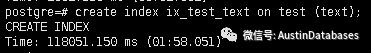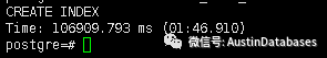 因为是SSD 的磁盘系统,所以时间上不明显,但也能证明加索引上调整 maintenance_work_mem 的确是能提高相关的速度。