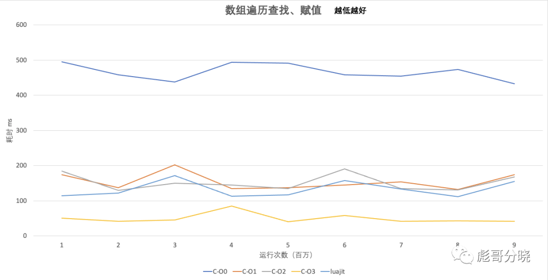 通过上图可以看到性能排行 C-O3 > C-O2 = luajit = C-O1 > C-O1
