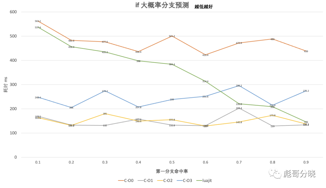从上图中可以看到,luajit在总体的执行中完全优于C-O0的。随着第一分支的命中率不断提高,大概在65%的时候超越了C-O3级别的优化,在 80-90%命中率的情况下基本追平了C-O2优化水平。所以在写lua代码的时候可以将大概率命中的if条件写在前面,这样有助于luajit做分支预判优化。