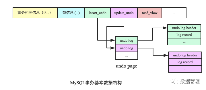 了解了MySQL行记录之后,再来看看事务的基本结构,下图是MySQL的事务数据结构,上文我们提到过。事务在开启之后会创建一个数据结构存储事务相关信息、锁信息、undo log以及非常重要的read_view信息。