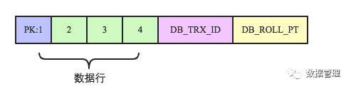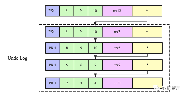 前面四列是该行记录的实际列值,需要重点关注的是DB_TRX_ID和DB_ROLL_PTR两个隐藏列(对用户不可见)。其中DB_TRX_ID表示修改该行事务的事务ID,而DB_ROLL_PTR表示指向该行回滚段的指针,该行记录上所有版本数据,在undo中都通过链表形式组织,该值实际指向undo中该行的历史记录链表。