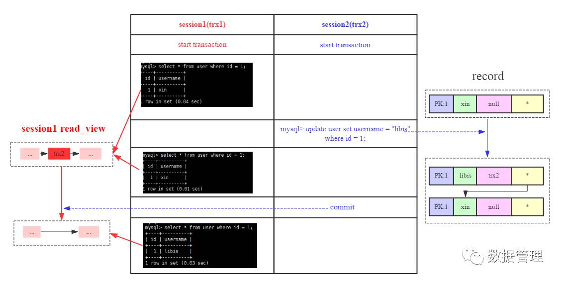 上文介绍了MySQL中MVCC技术实现机制,但要明白RC隔离级别下事务可见性,还需要get一个核心点:RC隔离级别下的事务在每次执行select时都会生成一个最新的read_view代替原有的read_view。