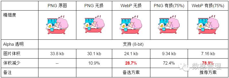 2010年10月份 Google 宣布了一种新的图片格式WebP,它可以将图片大小减少 40%,目的是替代当前的图片标准 JPEG,2011年11月Google宣布了 WebP 图片格式的一些改进,加入了透明格式支持,所以它同样也想取代掉 PNG 格式。经过测试webp的压缩效果非常好: