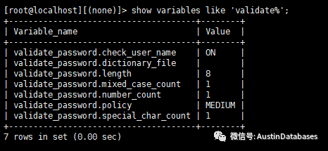 validate_password.policy= low 这是对密码的复杂度进行的要求,low 是要求密码的长度, MEDIUM 是要求大小写,数字和密码成都, STRONG 是除了上述的要求外,还要想字典文件中的内容。