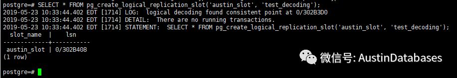 首先我们先要创建一个逻辑复制槽,并且使用系统给定的一个test_decoding的解码插件。