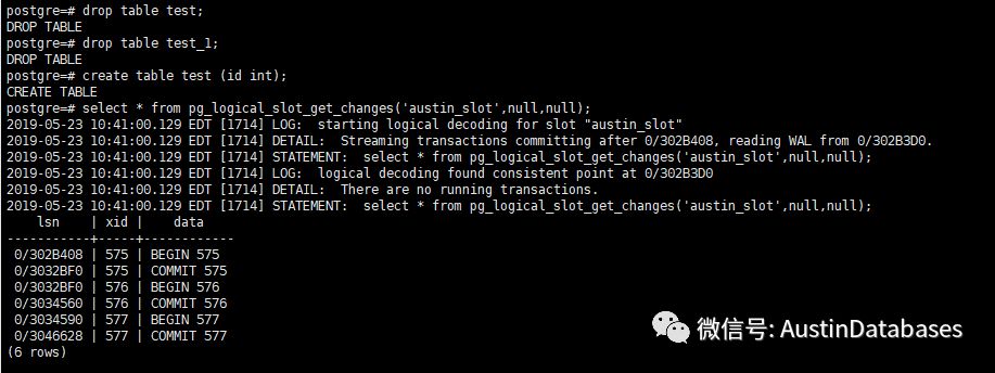 创建完复制槽后,我们开始一些相关的数据库操作,从下图可以看出想的DDL 操作并没有解析,仅仅是记录了begin commit