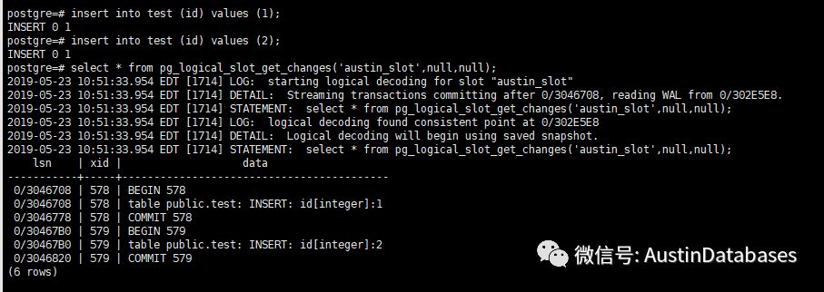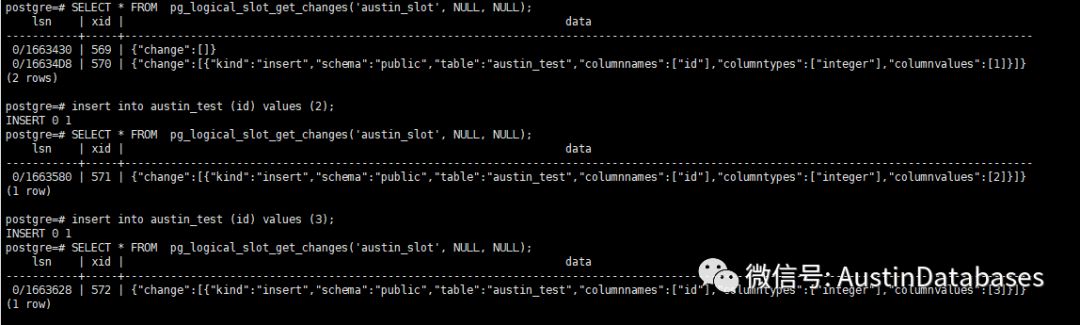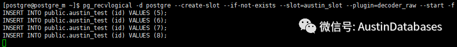 我们来在做做 DML操作,明显相关的记录可以被解码并且可以看出数据库刚才在操作了什么。