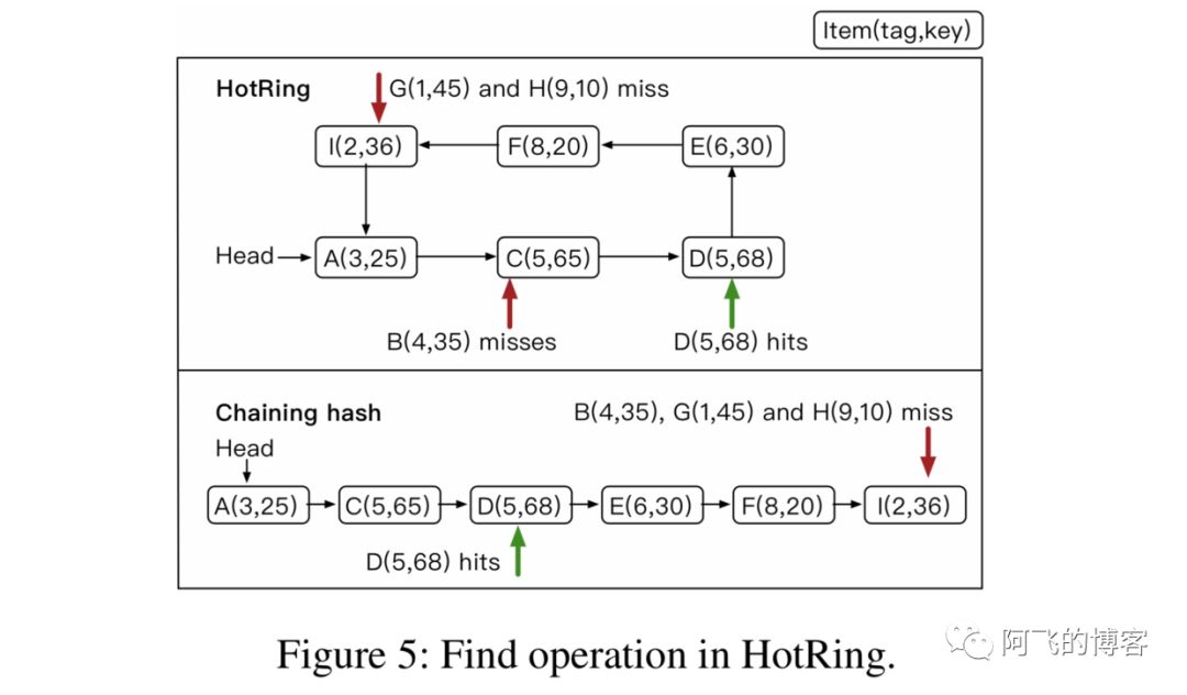 如上面的(Figure 4)图描述了HotRing的索引结构,它主要改进了传统Hash索引冲突链表结构。阿里HotRing的设计将最后一个KEY和第一个KEY连起来,并称之为冲突环。这样的话,Head指针可以指向任意一个元素,并不一定是固定在链表的第一个元素。这样的设计,就可以将Head指向热点数据。需要注意的是,当冲突环上只有一个数据时,Head的next指向它本身。