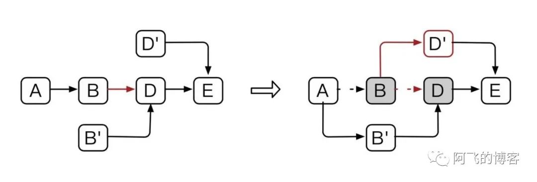 修改操作如下图所示,假设有一个线程将B修改为B‘,同时另一个线程将D修改为D‘,如果没有并发保护,就会导致最终的链路变成:A->B'->D->E,即D'会丢失: