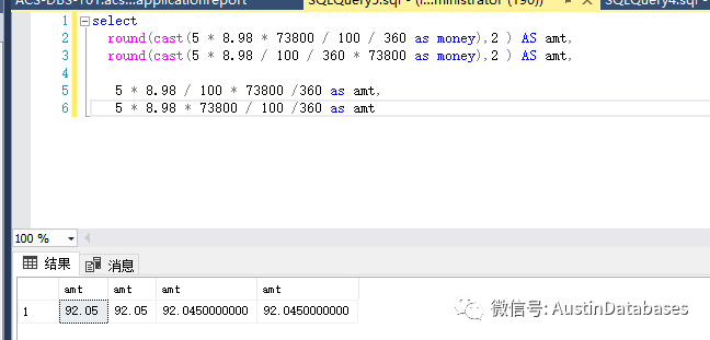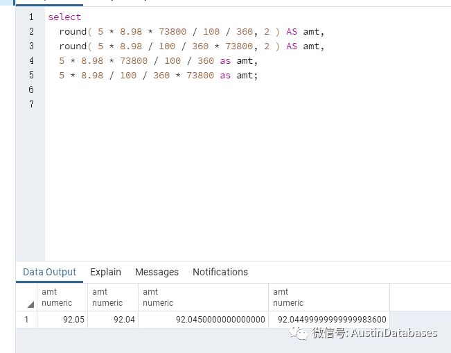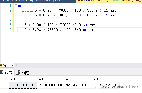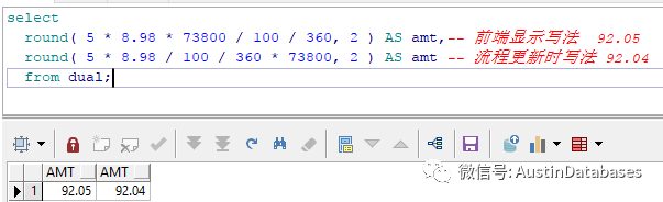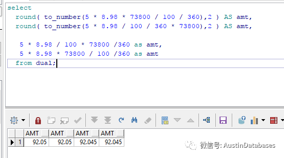 首先我们照搬上面的计算,图中很清楚的看到,结果和ORACLE 不同如初一辙